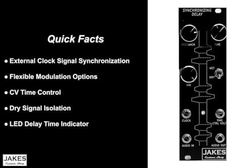 The Jake's Custom Shop Synchronizing Delay eurorack module is a sonic powerhouse that will take your modular synth to the next level. Create everything from subtle echoes to mind-bending washes of sound. Using the classic PT2399 integrated circuit and an AtMega328 embedded system this module goes far beyond what any other standard delay will do. Control Feedback, Delay time, and Wet/Dry mix with dedicated potentiometers to create an endless variety of sounds. Where this module really shines is its ability to sync delay time with an external clock signal. This allows you to vary the delay in sync with your rhythm, a unique feature. No musical instrument, let alone an analog synthesizer, is complete without a bit of delay to create a truly massive sound.