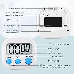 - Instructions for use: Press M/S button at the same time, clear to 00:00 status Press button, start count up Press M/S button, set your time Feature: Magnetic:The back of the kitchen timer has a strong magnetic and bracket design, which can be adsorbed on the refrigerator, blackboard or wall, and can also be flat on the table. The Big Sound:Even in the living room, you can hear the kitchen timer and don't worry about overcooking Easy to Carry:The 2.68*2.44inch/6.8*6.2cm timers are portable and do not take up much space Application Scenarios: Kitchen Helper\Fitness Partner\Beauty Assistant\A Ten-minute Break Notes: There may be slight color differences due to different screen displays.