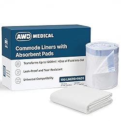 - Transform your space into an odor-free oasis with AWD Medical’s Commode Liners–a simple and effective sanitary solution. Designed to combine durability, convenience, and safety into one essential product, each absorbent liner is 0.4mm thick and crafted from quality, medical-grade LDPE to prevent tears and leaks, ensuring reliability in every use. The unique double drawstring closure of our commode disposable liners accommodates large capacities while the secure, leak-proof seal ensures no mess is left behind. Our adult potty liners are universally compatible, fitting a wide range of commode chairs, pails, and bedpans. Each disposable toilet liner is specially formulated to handle all types of bodily waste, providing a flexible and convenient solution for various care settings, from homes to healthcare facilities. We understand the importance of confidence and independence, especially for individuals with mobility challenges or those recovering from surgery. Our commode liner bags offer a dignified solution, restoring autonomy and ease for the elderly, hospital patients, and anyone requiring additional support. They are also perfectly suited for travel, compatible with RVs and bio-toilets, ensuring on-the-go cleanliness and convenience without compromise. Certification by ISO and registration with the Food & Drug Administration underline our commitment to safety and quality. These endorsements show that our commode liners meet stringent international standards, providing users with absolute peace of mind. Available as a 125-pack without commode pads, individually wrapped for hygiene. Or, opt for the 100-pack of bedside commode liners with absorbent pads that absorb up to 40 oz of liquid and turn it into a gel for a fresher, odorless environment. Choose AWD Medical’s bedside commode liners disposable for a trusted, effective approach to personal care and hygiene management, where convenience meets reliability in every pack.