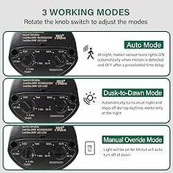【3 Modes in 1 Motion Sensor】"Auto Mode" when movement is detected in darkness the light will turn on & after 1min to 10 minutes it will turn off depending on your setting; "D2D Mode" Automatically turns on at night and stays off at daytime, work only in the night; "Manual Override Mode" allows manual control on and off, light will keep on for 8h but will auto turn off at dawn. 【Stepless Adjustable Time & Sensitivity】Pre-selected delay time of the motion detector is adjustable from 10-second to 10 mins on the "TIMER" knob, and the sensing coverage can reach up to 60 feet with a 180° detection range, which can be customized by yourself based on your specific requirement. 【Rotable Sensor Head】Designed with longer pivot arm, 180 degrees vertically, 300 degrees horizontally adjustable sensor neck, easier for you to aim the sensor where you want, suitable for most outdoor/indoor wall and eave mount applications, such as porch, back yard, front door, garage, driveway, walkway, step, etc. 【Replacement Motion Sensor】A great choice to repair or update your existing light fixtures without having to replace the entire fixture, save your money. The motion security floodlight sensor is easy to install and set up, wire nuts included, wire up easily. Load Rating: Max. 500W Incandescent Lamp, Max 200W LED DRIVER/ LED Bulbs. 【High-Quality Service】We provide 7*24h after-sales service and a 2-year warranty. Easy and fast replacement and refund for quality problems are guaranteed.