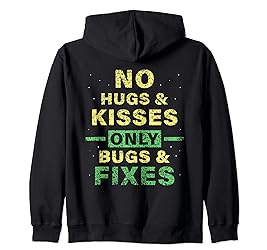 - Perfect for coding enthusiasts, this humorous design expresses a true coder's life with phrases like "No Hugs & Kisses Only Bugs & Fixes". An ideal gift for IT software developers who live and breathe programming. This trendy and witty design is suitable for all occasions. Whether you're working in a software developing job or debugging at a coding marathon, wear your passion for coding and programming on your sleeve.