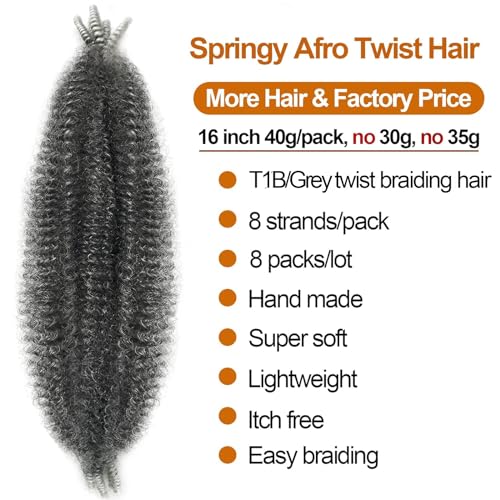 • 【Cuban Twist Hair Information】: 16 inch Tgrey pre-fluffed afro spring twist hair, 8 strands/pack, 40g/pack, 8 packs/lot, total weight is 320(±5)g/lot, very soft & fluffy, more hair & factory price,enough for full head.