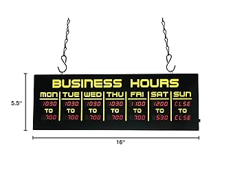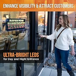 - Our Business Hours Sign: Seamless Programmability for Dynamic Displays! Revolutionize how you display your business hours with our state-of-the-art Business Hours Sign. Designed for versatility and convenience, this programmable electronic store hours sign not only showcases your store hours on a digital screen but allows for easy updates. Perfect for businesses that operate on varying schedules, this store time sign ensures your customers are always in the know. Whether you run a cafe, retail shop, salon, or any other customer-facing business, this business hour sign is versatile enough to meet your unique needs! Why Our Business Hours Sign? LED Business Sign With Remote AC Adapter With Hanging Kit 3-Year Warranty Programmable Business Signs Digital Screen Ultra Bright LEDs Easy to Read Visible in Daylight The Best ROI for your Business!