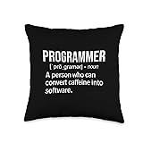100% Polyester Perfect for your family and friends who is a software engineer or aiming to be one. Programmer Definition : A person who can convert caffeine into software. Great Gift on Birthdays. 100% spun-polyester fabric Double-sided print Filled with 100% polyester and sewn closed Individually cut and sewn by hand Spot clean/dry clean only