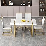 Ebullient Dining Table Set for 4,Rectangular Dining Table and White Faux Leather Dining Chairs, 5 Piece Dining Table Set,Modern Dining Room Table Set with Gold Metal Frame