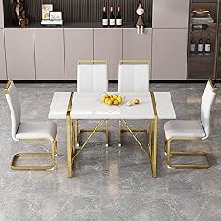 Modern Dining Table Set for 4:55 inch white dining table and faux leather dining chairs are a combination of simplicity and style with fresh colors, a perfect match for your dining room and kitchen. This dining table set for 4 will enhance the dining comfort for you and your family High Quality White Dining Table:This dining table set for 4 is made of high quality MDF, which is corrosion resistant, scratch resistant and high temperature resistant. Thickened stainless steel legs with strong weight-bearing capacity and rust-proof for long-term use 4 Leather Dining Chairs:The dining room set chairs are made of high quality PU leather, breathable and soft to the touch; filled with high elasticity sponge, which improves the comfort of the chairs. Thickened chrome-plated metal frame can support up to 300 lbs Dining Room Table Set for 4:Modern dining table size is 55.1''*31.5''*29.8'' (L*W*H), dining table weight capacity: 500 lbs, dining chair size is 16.54''*21.26''*39.37'' (L*W*H), dining chairs weight capacity: 300 lbs Wide range of uses:White dining table can be used as a display table, presentation table, etc. It is a good choice for family gatherings or parties. Dining chairs can be used to decorate living room, dining room, bedroom, kitchen, lounge, reception room, waiting room or conference room