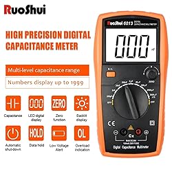 - DescriptionRuoShui Victor 6013 Digital Capacitance Multimeter High precision capacitance tester Handheld with 20000uF display inductance test LCR Manual Range 2000 CountsMain Feature◇ Easy and correct readout.◇ High measuring accuracy.◇ Measurements are possible even under a strong magnetic field.◇ LSI-circuit provides high reliability and durability.◇ Input overload protection is provided.◇ LCD display for low power consumption and clear readout even in bright ambient light conditions.◇ In-line pushbuttons allow one hand operation.◇ Light-weight and compact construction for easy operation.◇ Low battery condition is indicated on the LCD display.SPECIFICATIONSDisplay :LCD (Liquid Crystal Display) Max. Indication 1999.Measurement :C (Capacitance)Range :single 9 position, whole range value (from 0.1pF to 20000uF)Zero Adjustment :Manual (range:±20pF)Calibrate Adjustment :Have two internal adjustment. One is panel Zero adjustment.Over-input :Display shows "1".Backlight Function: it went out by itself within 8 seconds.Sampling Time :0~5secondOperating Temp :0℃ to 40℃.Operating Humidity :80% MAX.R.H.Power Supply :Single, standard 9 volt battery. NEDA 1604IEC6F22Typical consumption current :3~4mA (RANGE:200pF-200uF)