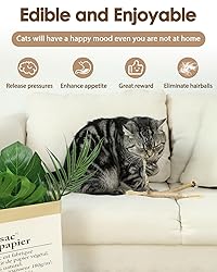 SAFE & 100% NATURAL: The silvervine cat toys for indoor cats are mainly made from pure natural silvervine sticks with sisal string, silvervine fruits, feather and bell. Cats will sniff, cuddle, kick and chew the cat toy, they are safe for cats to play and chew. INTERESTING: Silvervine sticks and its fruit contain Actinidine and Nepetalactone which are natural enrichment for indoor cats. Cats will respond positively to this kitten toys by rolling around, chin and cheek rubbing, drooling, and licking. They can help cats relieve stress and calm anxiety, feel relaxed and happy. CLEANING TEETH: The silvervine cat toys for indoor cats can help removing tartar and reducing oral issues through the chewing action. They also help cats keep fresh breath and increase appetite. The cat chew toy is a very practical gift for the bored indoor adult cats. MANY CHOICES: Including 6 pieces kitten teething toys with feathers, bell and dried fruit galls. Multiple feather cat toys can meet your cat's multiple needs. The self play cat toy are suitable all breeds of cats. REMINDERS: The silvervine cat toys have an irresistible and attractive smell for cats, but human can't smell it. Different cats react differently to this cat enrichment toy. Kittens may not show much interest in it. And the play sessions should be supervised, don't let them eat the feathers by mistake.