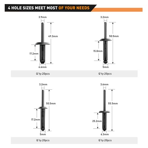 • 【Complete Kit】- Includes 1Pcs Plastic Rivet Gun and 80Pcs industrial strength polyoxymethylene (POM) rivets:20 each of 5mm x 15.8mm, 5mm x 17.2mm, 6.6mm x 17.2mm, and 6.3mm x 25.2mm , along with a Free Fastener Remover. Perfect for all your daily needs.