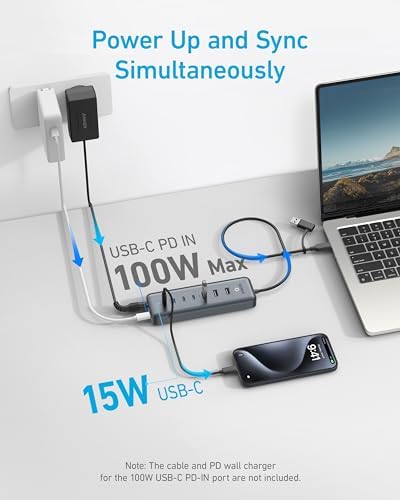 • Power and Performance: Designed for multitasking, enjoy swift data transfer while also powering your devices, featuring a 100W max PD-IN port for your laptop and a dedicated 15W USB-C port for your phone. (Note: This hub cannot charge your laptop on its own. To charge your laptop, you need to connect a PD wall charger to the PD-IN USB-C port.)