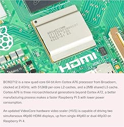 - Overview Featuring a 64-bit quad-core Arm Cortex-A76 processor running at 2.4GHz, RPi 5 delivers a ×2 to ×3 increase in CPU performance relative to RPi 4. Alongside a substantial uplift in graphics performance from an 800MHz VideoCore VII GPU; dual 4Kp60 display output over HDMI; and state-of-the-art camera support from a rearchitected RPi Image Signal Processor. For the first time, this is a full-size RPi computer using silicon built in-house at RPi. The RP1 provides the bulk of the I/O capabilities for RPi 5. Aggregate USB bandwidth is more than doubled, yielding faster transfer speeds to external UAS drives and other high-speed peripherals; the dedicated two-lane 1Gbps MIPI camera and display interfaces present on earlier models have been replaced by a pair of four-lane 1.5Gbps MIPI transceivers, tripling total bandwidth, and supporting any combination of up to two cameras or displays; peak SD card performance is doubled, through support for the SDR104 high-speed mode; and for the first time the platform exposes a single-lane PCI Express 2.0 interface, providing support for high-bandwidth peripherals. Features VideoCore VII GPU, supporting OpenGL ES 3.1, Vulkan 1.2 Dual 4Kp60 HDMI display output with HDR support 4Kp60 HEVC decoder LPDDR4X-4267 SDRAM(4GB and 8GB SKUs available at launch) Dual-band 802.11ac Wi-Fi Bluetooth 5.0 / Bluetooth Low Energy (BLE) microSD card slot, with support for high-speed SDR104 mode 2 × USB 3.0 ports, supporting simultaneous 5Gbps operation 2 × USB 2.0 ports Gigabit Ethernet, with PoE+ support(requires separate PoE+ HAT) 2 × 4-lane MIPI camera/display transceivers PCIe 2.0 x1 interface for fast peripherals(requires separate M.2 HAT or other adapter) 5V/5A DC power via USB-C, with Power Delivery support RPi standard 40-pin header Real-time clock (RTC), powered from external battery