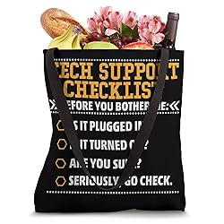 Tech Support Checklist is a funny t shirt for a men and women that loves sarcasm jokes, who have computer issues, computer problems. Perfect clothing apparel for Helpdesk guys, Is it plugged in, son, brother, daughter, dad, mom, computer geeks, loves humor Fresh Sarcasm Served Daily tshirt is a funny great gift for those that modem, router, IT Tech, monitor, internet not working, tech support definition, sysadmin, is it turned on, IT team for men, women, dad, sister, computer is not working for Birthday. 16” x 16” bag with two 14” long and 1” wide black cotton webbing strap handles. Made of a lightweight, spun polyester canvas-like fabric. All seams and stress points are double-stitched for durability, and the reinforced bottom flattens to fit more items and hold larger objects. Spot clean/dry clean only.