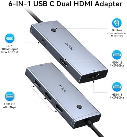 HODO Docking Station to Dual HDMI Monitors Adapter USB C to Dual HDMI Adapter 4K 60 Hz for Laptops Docking Station Dual Monitor with PD 3 USB Port Button Compatible for HP Elitebook Dell XPS 13 15 etc