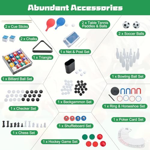 • 12 Game Options: This combo game table set includes 6 ball games (billiard, foosball, table tennis, hockey, bowling, shuffleboard), 4 board games (chess, checkers, poker, backgammon) and 2 toss games (ring toss, horseshoes). It is perfect to keep your family or guests of all ages entertained for hours!