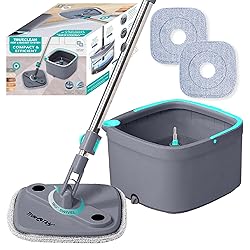 - Level up your home cleaning routine with the TRUE & TIDY Square Spin Mop & Bucket System—a modern, mess-free solution for floors that shine. Designed with function and convenience in mind, this system features a dual-chamber bucket that separates clean and dirty water, so every mop stroke is performed with fresh water for optimal hygiene. The built-in self-wringing mechanism is enhanced with a scrub brush that gently cleans the mop head during each spin—keeping your hands dry and your floors streak-free. The 360° swivel mop head allows you to glide effortlessly across the floor and easily reach under couches, around corners, and along baseboards. Paired with ultra-absorbent microfiber mop pads, this system lifts and locks in dirt, dust, and spills from tile, hardwood, laminate, vinyl, and more. A durable stainless steel handle adjusts to your ideal height and won’t bend under pressure, while the quick-fill water inlet streamlines refills without creating extra mess. When cleaning is done, simply rinse the reusable pads and store everything neatly—this sleek, square system is as compact as it is powerful. Whether you're cleaning your kitchen, bathroom, office, or studio, the TRUE & TIDY Spin Mop System gives you a professional-level clean with less effort and more comfort.