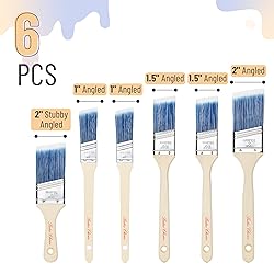 - Bates angled paint brushes set includes 6 pieces, with sizes ranging from 1 inch to 2 inches, providing a variety of options for different painting tasks.Each brush is designed with an angled edge, perfect for precision work, cutting in, and reaching tight corners with ease.The high-quality bristles ensure smooth and even paint application, suitable for all types of paints, varnishes, and stains.Sturdy wooden handles offer a comfortable grip and control, making these brushes ideal for both professional painters and DIY enthusiasts.This versatile set is perfect for detailed work as well as broader surface coverage, making it an essential addition to any painting toolkit.