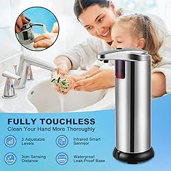 - 🌈🌈🌈Why Choose Our New Upgraded Touchless Automatic Soap Dispenser? Enjoy the convenience of this automatic soap dispenser, make your life safer and more colorful. 👉3 Adjustable Soap Liquid Level 3 different settings to adjust the amount of soap you want to be dispensed by adjusting the switch to control the liquid volume. 👉Infrared Motion Sensor Technology, Hygienic Cleansing Equipped with an infrared motion sensor, the soap dispenser will release hand lotion automatically when the sensor detects your hands. 👉Double waterproof base Designed with waterproof base and rubber seals to prevent the battery compartment from getting soaked in water which causes corrosion and the dispenser to fail. 👉Durable That Will Last For Years Made by advanced 304 stainless steel and ABS plastic material, durable and rust-proof, superb quality. 👉Widely Application Whether it's your Bathroom, Kitchen, Workplace, Restaurant, Hotel, or anywhere else you can imagine, we have you covered. ☻ Stay Clean: wash hands with this touchless auto soap dispenser and stay clean. ☻ Stay happy: touchless will make children, and also adults more willing to wash hands. 🌱SPECIFICATION: ➺Material: Stainless steel & ABS plating chrome ➺Capacity: 280ML ➺Power Supply: 4 x AAA Alkaline Battery (not included) 🌱PACKAGE INCLUDED: ☑1 x Automatic Soap Dispenser ☑1 x User Manual ☑1 x Package Box ✦Warm Tips ✍When used for the first time, trigger sensors 2 to 5 times until the soap begins to dispense. ✍If the soap is too thick, the machine may not produce liquid, just add a small amount of water and stir. ✍If there is some moisture in the new soap dispenser, it is left over from testing the product, not old or second-hand. ✍Please keep the bottom of the automatic soap dispenser dry, do not soak it in water to avoid damage to the unit