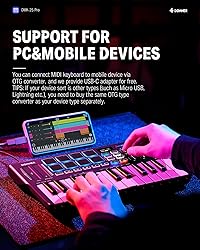 【TIPS】The DMK 25 Pro MIDI keyboard is not like a piano keyboard. It does not produce sound on its own and needs to be connected to a mobile phone or computer's DAW software for use. ( 4 types of DAW software are provided) 【Intelligent Dynamic Scale Mode】You can play essential bass lines, melodies, and leads with ease thanks to the intelligent dynamic scale mode of DMK 25 Pro. The 16-scale tones enable you to switch between many musical genres 【Real-time Multi-Mode Control】DMK-25 Pro MIDI controller unleashes creativity with arpeggio, note repeat, & chord functions. Craft music clips anytime, anywhere. Enhance performance joy & explore endless playability 【Personalized Touch Bar with Light Scale】Your composition is easier using Pitch/ Mod touch mode. Even at home, the touch bar with a light scale gives you the impression that you are on stage 【Innovative Wheels】4 innovative wheels for greater visual control and comfort when turning, custom mapping to allocate the information you need to control, and 6 transport controllers to improve arrangement efficiency 【Compatible with various DAW】Compatible with various DAWs like Cubase LE, Live, Logic Pro, Protools, Studio One, etc. Donner MIDI keyboard offers a full music production experience for your creations. Get your software from customer service 【40 Entertaining Keyboard-Teaching Courses】We've crafted beginner to advanced keyboard courses, perfect for music arrangement novices. 40 engaging lessons cover all arrangement essentials. Time to unleash your creativity 【High-Definition OLED Screen Display】The MIDI keyboard boasts a sleek panel & high-definition OLED display, showing real-time arpeggio, velocity, speed, etc. Simplify arranging & timbre creation 【Small and Lightweight】Small and lightweight! You can bring it with you to outdoor places such as studio, cafe. Record your inspiration whenever and wherever it strikes you 【4 Exquisite Velocity-Sensitive Curves】The velocity-sensitive keys and eight velocity-sensitive pads have the pressure and touch of a standard keyboard, but they are also very responsive