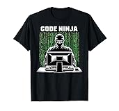 Retro Code Ninja design. Perfect for the programmer, coder, computer nerd. Programmer, Coder ninja design. Great gift for the PC software developer, computer geek, and ninja fan. Fun programing ninja at the computer with a retro computer code background style. Lightweight, Classic fit, Double-needle sleeve and bottom hem