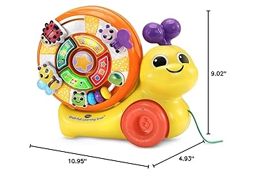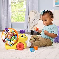 - No need to take it slow with this learning snail whose shell and antennae spin when it’s pulled! Grab the string and travel around, then sit and explore the double-sided shell that’s full of activities. There’s so much to see! Four light-up buttons boost language skills by introducing letters, shapes, numbers and colors. Twist the ladybug, flip the butterfly’s wings, spin the bee and slide the caterpillar beads to work on fine motor skills. On the other side, sort the three shaped blocks into their respective slots, which double as convenient storage when curious cuties are on the move. Sing-along songs and upbeat melodies round out the fun. Snailed it! Intended for ages 12-36 months. Requires 2 AAA batteries. Batteries included for demo purposes only. New batteries recommended for regular use.