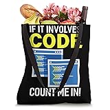 If It Involves Code, Count Me In!. Programming quote design for programmer. Computer programmer design perfect if you love programming. Perfect for any computer sciencetist, computer engineer and tech guys. Get ready and make your computer beep boop. 16” x 16” bag with two 14” long and 1” wide black cotton webbing strap handles. Made of a lightweight, spun polyester canvas-like fabric. All seams and stress points are double-stitched for durability, and the reinforced bottom flattens to fit more items and hold larger objects. Spot clean/dry clean only.