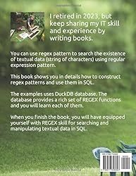 - You can use regex pattern to search the existence of textual data (string of characters) using regular expression pattern.This book shows you in details how to construct regex patterns and use them in SQL.The examples uses DuckDB database. The database provides a rich set of REGEX functions and you will learn each of them. When you finish the book, you will have equipped yourself with REGEX skill for searching and manipulating textual data in SQL.
