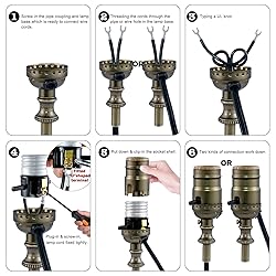 - Installation Instructions: 1. Collect the lamp base you like (a favored bottle, your handmade wood base ect..). prepare a light bulb, a 7-9inch lamp shade ready for use. Find a plier and a "+"shape screwdriver as the assembling tool. The parts of lamp DIY kit is complete. 2. Check steps instruction of instructions(wiring part). 3. Wire Connection of Copper and Silver Screw Copper screw is for firing line. Silver screw is for naught line. If your input power is normal alternating current(AC). Any wire could connect any screw.
