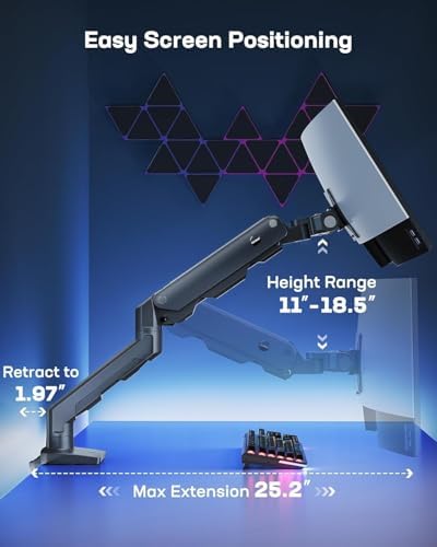 - Full-Motion Adjustability for Ergonomic Comfort: Achieve the perfect viewing angle with -60° to +15° tilt, 360° rotation, and ±90° swivel. The 25.2" extended arm reach allows you to position your ultrawide monitor exactly where you need it—whether for multi-screen setups, deep desks, or optimized ergonomic positioning. Plus, the monitor can be raised up to a height of 18.5 inches, giving you even more flexibility in customizing your workspace. Ideal for gaming and office work.