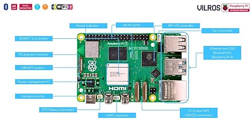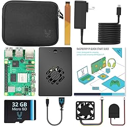 - Vilros Raspberry Pi 5 Basic Starter Kit with Metal Case This new ( PI 5 Launched -October 2023) flexible computer circuit board can take the place of your desktop computer, and be used for a wide range of pragmatic and non-pragmatic projects. While this hardware may look intimidating to novices, it is one of the most basic kits available to start building your own computer. What’s more, it comes with a quickstart guide that will help you assemble your processor with ease. The most alluring feature of the Raspberry Pi 5 is its power with such a small form factor and flexibility. This kit enables you to fully utilize the board without fear of throttling due to overheating as it includes a case that passively and actively cools the Raspberry Pi 5 via heatsinking contact with the board as well as a pi 5 compatible PWM fan. What’s Included in this Vilros Raspberry Pi 5 Basic kit Raspberry Pi 5 (Choose GB Capacity) Metal-Aluminum Alloy Passive+Active Cooling Case Vilros Raspberry Pi 5 compatible Power SupplyPWM fan With 10k Max RPM Capacity (built into case) 32GB Micro SD card loaded with Raspberry Pi OS (64 bit)HDMI (female) to Micro-HDMI (male) Adapter Quickstart Guide, Fourth Edition(Updated for Pi 5) Neoprene Storage Bag Mini To Standard Camera Module Adapter Cable to use a camera module with a Pi 5 LIR2032 Battery Connector For Raspberry Pi 5 RTC Port (connector ONLY Battery NOT Included) Uses Include: Desktop Computer ReplacementRetro Gaming SetupsBuilding Web ServersBuilding a Stop-Motion CameraBuilding Multiplayer Network Game Servers (Compatible with Open-Source Games Like Minecraft, Quake & Doom)Controlling RobotsMaking Time-Lapse VideosPlaying Audio-Visual MediaPrinting Documents from Outdated PrintersBuilding a Network Monitoring Tool& Much More! Note: Keyboard, Mouse, and Monitor are not included.