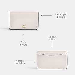 Editor's Notes: Detailed with our Signature hardware, this sophisticated Slim Card Case is crafted of refined leather and finished with an exterior slip pocket for easy access items Refined Calf Leather: Get a feel for it. Our refined calf leather is sophisticated & sleek - for a perfectly iconic Coach bag Organized Essentials: This slim wallet is big on organization. Secured by a snap closure, the bifold design features multiple card slots, inside slip pockets for cash or receipts and a zip pocket for coins or small accessories It's All in the Details: 4 credit card slots, inside open pockets, zip coin pocket, snap closure, outside open pocket. 5" (L) x 3 1/2" (H) x 1" (W) This is COACH: Having the courage to be real since 1941. COACH is the Original American House of Leather - with a legacy of craft and a community that champions the courage to live authentically