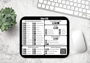 Displays essential Command Key Functions as well keyboard shortcuts for Apps like Safari and Finder. Learn how to Take Screenshots, Force Quit an Application, and access different Startup Modes. Durable, smooth surface optimized for mouse control and tracking Non-slip rubber backing prevents sliding around