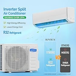 - The ROVSUN smart Split Type Type Inverter Air Conditioner with heating function is powerful to quickly cool down / warm your home, office, garage or apartment for maximum comfort in quiet operation, perfect appliance in hot Summer or cold Winter. Comparing with others, machine featured with high 17 SEER2 grade, which means that it is more energy efficient and much money saving! This unit also has Sleep, Turbo, ECO, Mute and Timer functions and the device can easily be controlled and adjusted from the remote control. These functions help you enjoy the true individual comfort! Specifications: 11500 BTU-115V-17 SEER Noise Level: 29-42 (dBa) Recommended Area: 300-550 sq.ft. Indoor Unit Dims (WDH): 30.6'' x 7.91'' x 9.84'' Outdoor Unit Dims (WDH): 30.6'' x 11.42'' x 19.61'' 11500 BTU-230V-17 SEER Noise Level: 33-45(dBa) Recommended Area: 300-550 sq.ft. Indoor Unit Dims (WDH): 30.6'' x 7.91'' x 9.84'' Outdoor Unit Dims (WDH): 30.6'' x 11.42'' x 19.61'' 17000 BTU-230V-17 SEER Noise Level: 33-43 (dBa) Recommended Area: 550-1000 sq.ft. Indoor Unit Dims (WDH): 35.83'' x 8.11'' x 11.57'' Outdoor Unit Dims (WDH): 31.88'' × 12.00'' × 21.61'' Package Includes: 1 x Air Conditioner 1 x Remote Control 1 x Installation Kit No hard-wired power cord Warm Notice: 1.Confirm voltage & BTU before making order 2. Shedule HVAC pro installation after receiving both 2 separate boxes of each ac unit