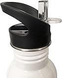Made of stainless steel Flip up spout with removable straw High gloss coated white exterior; image printed on both sides Fits most cup holders, capacity 21 ounces Not intended for dishwasher or microwave use