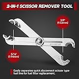 - Features: The transmission line tool can be used for use with most fuel lines, air conditioning lines, radiator and heater hoses. The fuel line tool is made of aluminum alloy and plastic material, long lasting tools. The scissor type fuel line remover is great for fuel pump disconnects as well as most metal fuel filters. This master quick disconnect tool kit can separate standard sizes of automotive AC hoses and fuel lines. The transmission line tool fits a wide variety of domestic vehicles. Contents: 4 x Spring Lock disconnect Tools 6 x Oil Cooler Line Disconnect Tools 1 x Quick Disconnect Tool for Ford 2 x Rubber Inserts 1 x Scissor Type Fuel Line Remover 2 x Ford Oil Cooler Line Removers 7 x Plastic Clip Disconnect Tools 3 x Spare Rubber Bands