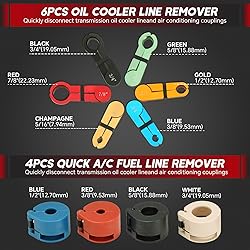 【Reliable Function】The master quick disconnect tool set comprises a comprehensive array of maintenance tools designed for disconnecting standard-sized fuel lines, automotive air conditioning hoses, AC pipelines, radiators, and heater hoses. 【Premium Quality】The 22PCS fuel line disconnection kit is made of aluminum alloy, plastic, steel, and various other materials. These fuel line disconnect tools are robust and built to last, ensuring long-term serviceability. The plastic case facilitates convenient storage and transportation. 【Easy to Use】The automotive fuel air conditioning line disconnect set is versatile, serving for quick release and spring lock connections. Each tool is color-coded by size for effortless identification. Simple push-pull operation facilitates access to hard-to-reach areas with ease. 【Package Included:】The master quick disconnect tool kit includes 6pcs transmission oil cooler line remover, 4pcs quick AC fuel line remover, 7pcs fuel line remover for disconnecting 1/4", 5/16", 3/8", 1/2", 5/8", 3/4“ and 7/8" fuel line, Scissor Fuel Line Disconnect Tool 4-1/2". 【Versatile Use】This master quick disconnect tool kit facilitates the separation of standard sizes of automotive AC hoses and fuel lines. The line disconnect tool kit is applicable for disconnect multiple sizes of fuel lines including 1/4 inch, 1/2 inch, 5/16 inch, 5/8 inch, 3/8 inch, 3/4 inch and 7/8 inch. 4 colored quick ac fuel line quick disconnector 3/8", 1/2", 5/8" & 3/4".