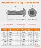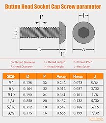 - Product Specification The #6-32x1/4" button head cap screws and bolts are made of high-quality stainless steel, which is superior to fasteners made of ordinary steel, carbon steel, and other materials. They have high corrosion resistance and rust prevention effect. Screw Parameters: Screw Size:#6-32 Thread Pitch:32 TPI; Thread Length:1/4" (excluding the head) Thread Diameter : 0.138" Thread Coverage : Full Thread Head Diameter :0.262" Head Height : 0.073" Finish : Bright Finish Allen Hex Drive :5/64" Material : 304 Stainless Steel Package Included 100pcs #6-32x1/4" Socket Head Cap Screws/Bolts