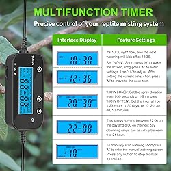 【DIY Rainforest Misting System】Build a customized misting setup for your terrarium. Includes a 16.4 ft tubing, connectors, and 6 rotatable nozzles — easy to arrange and expand for different tank sizes. 【External Timer Controller】Simple 3-button timer lets you set misting duration (up to 9 minutes) and interval: 20/30/40 minutes, 1–23 hours, or 1–30 days. No worries when you're away for a few days. 【Adjustable Nozzle Joints】The nozzle joints rotate 360°, letting you aim water precisely. Provides multi-angle coverage to distribute water evenly throughout your terrarium. 【Draws Water from Any Container】No built-in water tank required. Just place the tube into a bucket or container—the self-priming pump automatically draws water and produces a fine mist. 【Upgraded Quiet Pump】The upgraded water pump features high pressure, a compact design, and durable performance. It can connect up to 10 rainforest nozzles and operates with low noise. 【Water & Filtration】Equipped with an external filter to reduce impurities before water enters. Removable for easy cleaning. Use clean water (tap water) and avoid sand, debris, or oil to prevent clogging.
