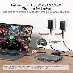 Important Notes: 1. Only support mirrored mode on macOS. 2. Make sure 3 cables (USB-B, HDMI, and DP) are connected to your destop. 【Package Include】1x KVM Switch Docking Station, 1x Power Adapter (DC 12V 3A),1x USB 3.2 Gen 2 Type-C to Type-C Cable (L = 1m), 1x USB 3.0 Type-B to Type-A Cable (L = 1.5m),1x HDMI 2.0 Cable,1x DP 1.2a Cable, 1x User Manual. 【Dual Screens, Double Productivity】 Effortlessly connect 2 computers(1 laptop+1 desktop) to 2 monitors with this all-in-one KVM switch docking station. Seamlessly switch between work and personal devices with a single button, eliminating cable clutter and maximizing efficiency. 【11-in-1 Powerful Docking Solution】 This KVM switch for laptop and desktop transform your setup with multiple ports: 3x USB 3.0, 2x USB 2.0, 1x USB-C, 1G Ethernet, SD card slot, 3.5mm AUX audio, and 2x HDMI outputs. Easily create a professional-grade workstation at home or in the office. 【Stable & High-Speed Wired Network】 Say goodbye to lag and unstable Wi-Fi! The built-in 1G Ethernet port on the KVM switch 2 monitors 2 computers ensures a fast and reliable wired connection, making it perfect for remote work, video conferencing, and online gaming. Note: The Ethernet port only provides a network connection for your laptop. 【Advanced EDID Emulation】 This KVM switch dual monitor with advanced EDID emulation and automatic device wake-up, switch between 2 computers in just 2-3 seconds. Press the front button for fast, seamless transitions—perfect for high-efficiency multitasking. 【Fast 100W USB-C Charging】 Charge your laptop with up to 100W power while transferring data at lightning speeds. No more interruptions—stay connected and powered up while working or gaming. Note: When charging your laptop, please use additional USB-C power adapter and connect it to the charging port on the KVM docking station. 【4K@60Hz Ultra HD & Smooth Gaming】 Supports stunning 4K resolution at 60Hz for crystal-clear visuals. Also compatible with 144Hz/120Hz at 1440P and 240Hz at 1080P, delivering a fluid, lag-free gaming and work experience.