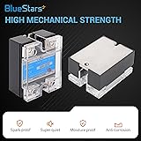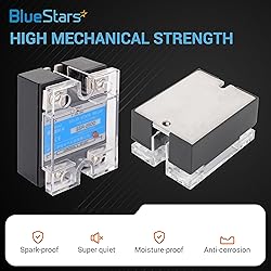 OPTIMIZED PERFORMANCE: Each BlueStars SSR-25DD Solid State Relay comes with detailed instructions for optimal installation, ensuring faster temperature dissipation and extended lifespan. PRECISE SPECIFICATIONS: BlueStars Solid State Relay SSR-25DD, DC 3-32V Input, DC 5-200V Output, 25A Current & Frequency: 50/60Hz. Total size (approximate): 58 x 45 x 32mm; Net weight: 168g (approximate). Material: metal, plastic, electronic components. VERSATILE APPLICATION: Experience a switch with no spark, no noise, high switching speed, anti-corrosion, moisture-proof, anti-vibration, long life, high reliability, and electromagnetic compatibility. Ideal for automatic process control, temperature control, heating/cooling systems, and CNC machinery. ROBUST & RELIABLE: Crafted with a heat-dissipating metal back plate and copper terminal lug for superior conductivity. BlueStars ensures longevity with a high-quality semiconductor optocoupler, spark-proof, noiseless operation, and zero cross-trigger control. Suitable for harsh environments. LIFETIME ASSURANCE: Enjoy reliable performance and peace of mind with BlueStars lifetime protection, covering any defects or issues that may arise. Your satisfaction is our priority.