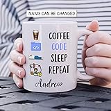[PERSONALIZED GIFT]: Do you need a gift idea for Halloween, Christmas, Valentine's day, Birthday, Family Occasion, Father's Day, or Mother's Day? This custom Coffee Code Sleep Repeat coffee mug will make an useful mug gift for Grandpa, Grandma, Dad, Mom, Brother, Sister, Women, Men or your loved ones. [CUSTOM COFFEE MUG]: Click "Customize Now" and start to design your great quality mug. You just need select size then enter name you want to customize. The design is printed on both sides of coffee mug. [PREMIUM QUALITY]: All of our coffee mugs are made of professional grade ceramic, ensuring they are tested for durability and sharpness on each product. Microwave & dishwasher safe. Suitable for hot and cold beverages. [PERFECT SIZE]: This perfect sized coffee mug is available in 11oz or 15oz sizes. Perfect size for travel, work day and so much more! Great for all your favorite hot and cold beverages. [SATISFACTION GUARANTEED]: Please feel free to contact us any time if you have any problem with your order. Customer satisfaction is our first priority!