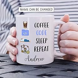 - Coffee Code Sleep Repeat Mug, Personalized Unique Software Developer Pottery Cup With Name, Tea Cup Gift For Future Software Developers, Funny Ceramic Mug, Custom Engineer Cup, White Cup 11oz 15oz HIGH QUALITY CERAMIC MUG: All of our coffee mugs are made of professional grade ceramic, ensuring they are tested for durability and sharpness on each product. Microwave and dishwasher safe for your convenience. Design is printed on both sides of the mug so that both lefties and righties can enjoy it. Employing the latest in print technology create the designs are high quality and will not peel off or fade away. EASY TO USE: C-shaped handle & thick and clean cup wall, comfortable to hold. This perfect sized coffee mug is available in 11oz or 15oz sizes. This novelty ceramic coffee mug is a useful mug gift to coffee lovers or tea drinkers. Perfect for daily home use, travel or more at the office. MAKE A BEST MUG GIFT: This novelty white Software Developer coffee mug is perfect mug gift for anyone on any occasion. This coffee mug make unique and novelty mug gift for Software Developer, Software Engineer, Programmer, IT, Debugging, Coworkers, Friends, Teacher, Student, Friends, Men, Woman or your loved ones. Perfectly suitable for many occasions including: Christmas, Birthday, Thanksgiving, Valentine's Day, Graduation, Thank You or any occasion. ☞ If you have any questions or concerns about the purchase, please do not hesitate to contact us.