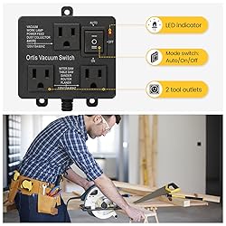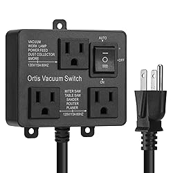NEW GENERATION-TWO POWER TOOL OUTLETS: The Ortis vacuum switch features two tool outlets, allowing multiple tools to be easily connected without the need for additional power strips. It offers three vacuum operation modes: automatic, off, and on, with auto switching, enabling you to effortlessly save time and effort when starting your tools and vacuum cleaner, so you can focus on more important tasks AUTOMATIC DELAY FEATURE: The auto vacuum switch comes with an automatic delay feature, which allows a 1-second delay when start the vacuum and automatically delays vacuum turn off by 7s (in auto mode). This helps prevent circuit overload, reduces dust in the air, keeps your workspace cleaner, and enhances your productivity. It's an essential tool for your woodworking EASY INSTALLATION: Compared with other vacuum switch, Ortis vacuum switch for power tools offers two fixing methods, screw fastening and traceless wall-mounting adhesive, ensuring firm and reliable attachment. You can effortlessly complete the installation, saving time and effort, and enhancing your user experience SAFE AND RELIABLE: Employing UL-certified American standard 14AWG power cords, engineered to handle currents of 30A and above, we enhance safety, reliability, efficiency, and stability. With reinforced copper cores and V0-rated flame-retardant materials in the outer casing, heat generation during usage is minimized, ensuring prolonged lifespan and optimal performance COMPATIBILITY: Supports a variety of cutting tools from rotary handheld devices to large shop saws such as Miter Saws, Table Saws, Power Sanders, Routers, Joiners, Planers etc. Max motor rating should not exceed 120V/15A 50/60Hz, 1875W