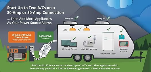 Plug-and-Play RV Soft Starter (No Installation Required) - Simply plug in and power up your RV A/C in seconds—no tools, wiring, or rooftop access needed. Designed to safely start and run up to two RV air conditioners from a single power source. Compatible With 50A, 30A, and 20A Power Sources - Allows operation of two A/C units on 50A, 30A, or 20A RV power without tripping breakers. Optimizes available electrical power for smoother startups without increasing total wattage. SoftStart Technology Reduces Startup Surge by ~50% - Lowers inrush current from approximately 50–60A down to 25–30A for quieter A/C starts, reduced electrical stress, overload protection, and extended A/C compressor life. RV Compatibility Guide – Please Read Before Purchase - Compatible with travel trailers and Class B motorhomes & Class C motorhomes without an Automatic Transfer Switch (ATS) or existing soft starters. Not compatible with Class A motorhomes, 5th wheels with ATS, or RVs with soft starters. Portable, Durable & Includes Adapter - Compact, water-resistant design allows easy transfer between RVs or compatible home appliances. Includes a 50A-to-30A adapter. Designed in the USA with safety and reliability in mind.