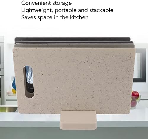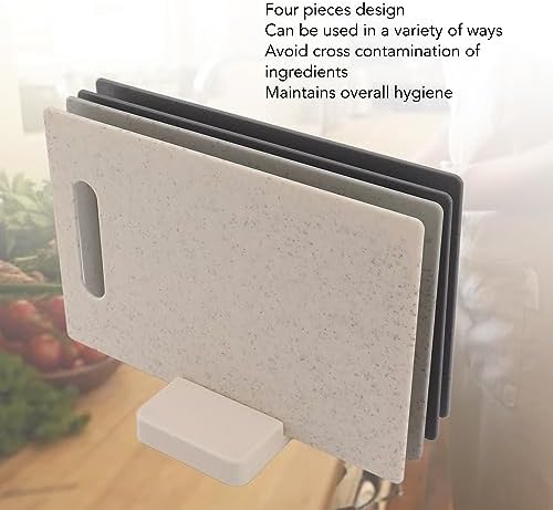 [FOOD GRADE MATERIAL] The chopping board set is crafted from premium food grade plastic, ensuring safety and health by being environmentally friendly.[MULTIFUNCTIONAL DESIGN] Ideal for cutting and separating various ingredients like meat, fruits, and vegetables, making it versatile for different kitchen needs.[4PCS DESIGN] Includes four pieces for categorized use, keeping overall kitchen hygiene in check.[STORAGE RACK INCLUDED] Features a convenient storage rack to keep the cutting boards organized and the kitchen clutterfree, saving valuable space.[EASY TO CLEAN] The flat surface design of the plastic chopping board makes it effortless to clean and maintain, ultimately saving time and effort in the kitchen.Spec:Item Type: Chopping BoardMaterial: PlasticWeight: Approx. 712g/25.1ozCutting Board Size: Approx. 283x185mm / 11.14x7.28in Storage Rack Size: Approx. 137x84mm / 5.39x3.31in Package List:4 x Chopping Board1 x Storage RackNote:Manual measurement please allow some error.