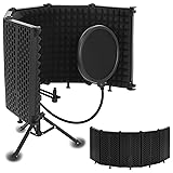 Microphone Isolation Shield, 5-Fold Adjustable Portable Reflection Filter with Tripod Stand & Pop Filter for Home Studio, Podcasting, Streaming, Fits Most Condenser Microphones