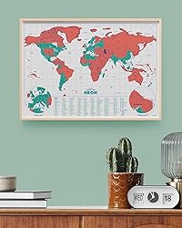 NEON SCRATCH MAP - Transforms your travels into art with its shimmering copper foil layer. It's the most detailed version added islands and US AU CA state lines. Allows travelers to track their journeys by revealing vibrant colors beneath, creating a personalized record of their adventures. GEOGRAPHIC TRACKING - Our Scratch Map goes beyond countries, with added islands and more intricate detail, alongside US and Australian state lines plus Canadian provinces and territories. This allows for precise, detailed tracking, helping you map every journey to personal travel record. VIBRANT REVEAL WORLD MAP - The A3 size of this scratch off world map is perfect for creating an eye-catching piece of wall art. The unique neon purple foil and the vibrant map it reveals offer a modern and stylish aesthetic that enhances any room. Use a coin to remove foil and track your travels. COMPACT TRAVEL-SIZE DESIGN - This Scratch Map is specifically designed in a travel-size format, making it the perfect portable companion for any adventure. Easily fitting into your suitcase or backpack, it lets you track your journeys on the go and comes complete with a protective hard map case to keep your scratch-off poster safe and sound wherever your travels take you. EDUCATIONAL INFOGRAPHICS - Along the bottom, our Scratch Map features fascinating and colorful infographics about land and oceans. This transforms your map into an engaging educational tool that not only sparks curiosity but also provides a wealth of facts, learning about the world fun.