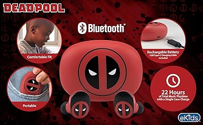 - Deadpool wireless earbuds feature a cool design inspired by the popular Marvel character! Stream your favorite audio content when you connect to any compatible device, including iPhone, Android, Samsung, and more. Listen to playlists, watch movies, TV, and YouTube, or use for gaming, audiobooks, and more. The built- in rechargeable battery allows up to 22 hours of total music playtime. Plus, the included charging case adds 2.5x extra charge. USB-C charging cable included. Use these earphones with microphone to stay connected with friends and family, too. With sleek Deadpool graphics, these earbuds make a great gift for any Marvel fan. Visit the eKids brand store to explore even more earbuds for kids.