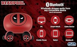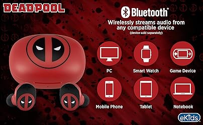 Wireless Earbuds: Connect any device including smartphones, tablets, and computers to wirelessly stream high quality stereo sound for entertainment and/or education. Listen to music or audiobooks, watch movies, TV, YouTube, and more. Ideal school supplies for classrooms or homework. Portable and Rechargeable: These kids earbuds are ideal for school, home, or travel. Enjoy up to 22 hours of total music playtime. The included charging case adds 2.5x extra charge. USB-C charging cable included. True Wireless Earbuds with Microphone: Chat with friends and family with ease during a video call or while gaming. Ideal wireless earbuds for iPhone and Android. Deadpool Design: Featuring cool Deadpool graphics and matching charging case, these Bluetooth earphones have an ergonomic shape that provides lasting comfort. Includes rubber ear cushions in 3 sizes: small, medium, and large. Perfect Gift: Wireless earbuds for Android and iPhone devices make great gifts. Visit the eKids brand store to explore even more kids earbuds.