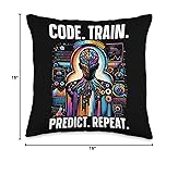 100% Polyester Artificial Intelligence AI Machine Learning Engineer. Interested in AI technology? Are you a fan of futuristic robots? Grab this Code Train Predict Repeat. Cool for a machine learning engineer into artificial intelligence. Are you a fan of robotics and computer programming? Love to automate and use AI technology? Are you an ai lover into data science and deep learning? If yes, then this machine learning design is for you. 100% spun-polyester fabric Double-sided print Filled with 100% polyester and sewn closed Individually cut and sewn by hand Spot clean/dry clean only