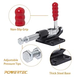 - The POWERTEC 20318 Ductile-Iron Base, Push/Pull Quick-Release Toggle Clamp, 500 lb Capacity, 305-CM, 4PKDelivers a rock-solid grip on your stock when your project requires a push/pull holding-action that locks your workpiece, flush and tight, against a positive stop. It's the woodworker's essential solution for use in your jigs, fixtures, assemblies and movable bases.Easy adjustability means customizing clamp to stock thickness and placement is hassle free. With its superior, vibration-resistant, ductile-iron base, you are assured the kind of stable stock placement that allows for optimal woodworking safety and efficacy. And because ductile iron has an enhanced capacity to stand up to (sustain, absorb) maximum tensile strength, you can depend upon the ultra-potent hold of these clamps in even your most demanding applications. Lastly, having greater yield strength than cast steel, this unique material gets top marks in durability and high-performance - so you can get the job done to perfection, time and time again.The clamp body itself is ruggedly constructed of zinc-plated, cold-rolled carbon steel that resists corrosion, and is the industry-grade material of choice for clamping components. Featuring side clamping action that provides the unique ability to securely grip your workpiece in a vertical or horizontal position. , this handy tool maximizes work-surface clearance, leaving you free to create master craftsmanship - quickly and with ease. Handle opens a full 180 degrees, so edge mount this device to your fixture or work surface to take advantage of the full clamping range. Last but not least, its ergonomic ribbed-plastic handle provides a comfortable, safe and sturdy grip that allows for enhanced user leverage and control. Streamline your projects with this ingenious device. Simple to install, adjust and use. Just pull handle to activate firm pushing clamp-action - its' that easy.Maximize utility, efficiency and woodworking satisfaction with POWERTEC Ductile-Iron Base, Push/Pull Quick-Release Toggle Clamp. We've got a secure grip on clamping perfection.Clamping Base Dimension: 2" x 2" -1/4"Mounting slot measures: 1/4" DIAClamping range extends from 1-3/4" to 2-5/8"Bolt length: 1-1/2"Clamp height (including handle) when fastened: 3-7/8"Total Clamp length (including handle) during use: 5-3/8" - 6-1/4"